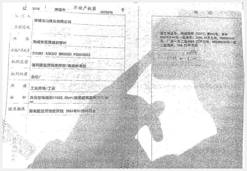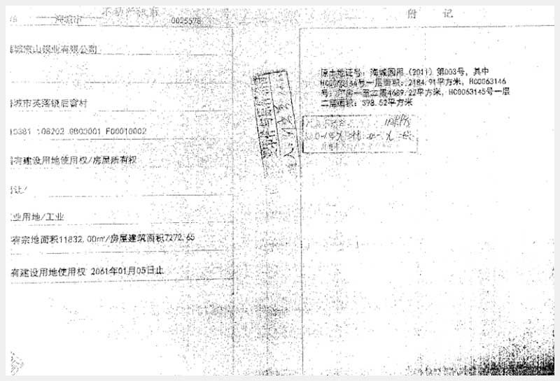 名稱:海城市英落鎮(zhèn)后窨村房產(chǎn)、土地使用權(quán)及機(jī)器設(shè)備 面積:房產(chǎn):有證:7272.65㎡,無(wú)證:5963.33㎡;土地:11832㎡;設(shè)備:776套 瀏覽次數(shù):1113
