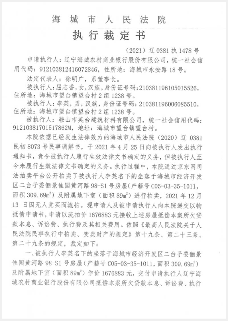 地址:海城經濟技術開發區二臺子委儷景佳園 標的號:188