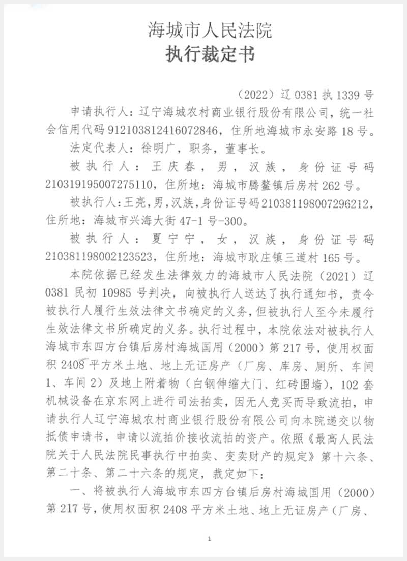251號 海城市東四方臺鎮后房村房產、土地使用權及機器設備