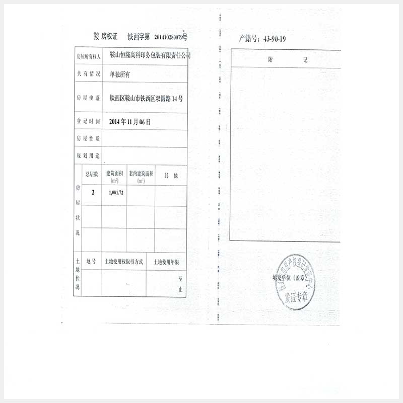 名稱:鞍山市鐵西區雙圓路14號房產及土地使用權 面積:房產:4476.74㎡;土地:5652.3㎡ 瀏覽次數:86