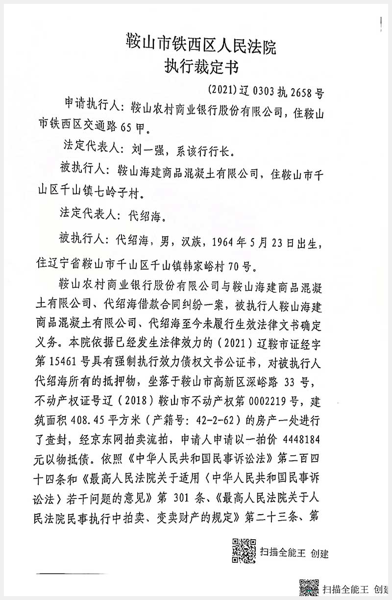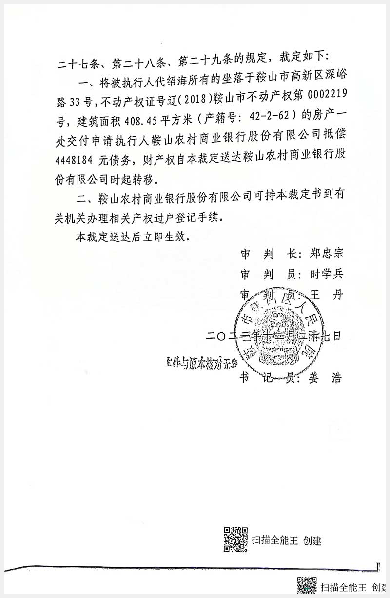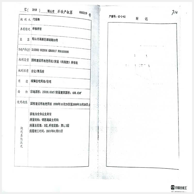 名稱:鞍山市高新區深峪路33號房產 面積:408.45㎡ 瀏覽次數:270