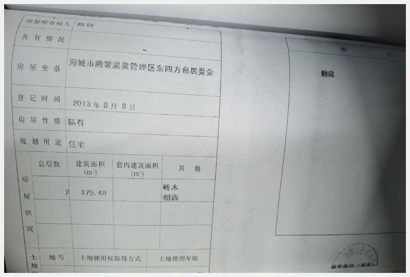 名稱:海城市騰鰲溫泉管理區東四方臺房產 面積:375.48㎡ 瀏覽次數:1455