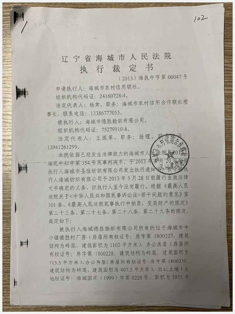 102號 海城市中小鎮德勝村房產及國有土地使用權