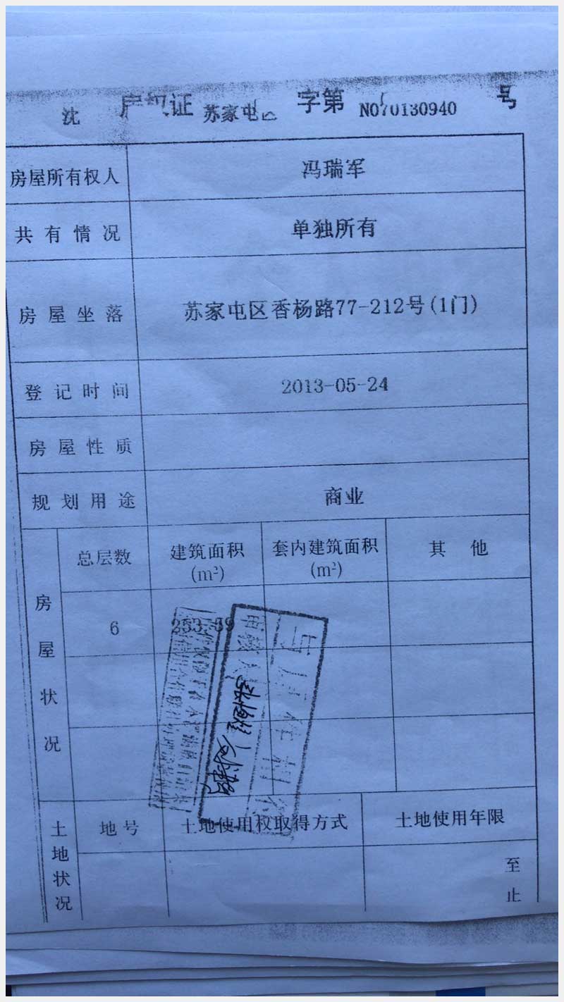 名稱:沈陽市蘇家屯區香楊路77-212號(1門)房產 面積:253.59㎡ 瀏覽次數:1497