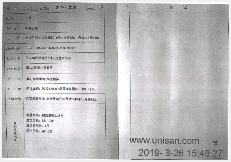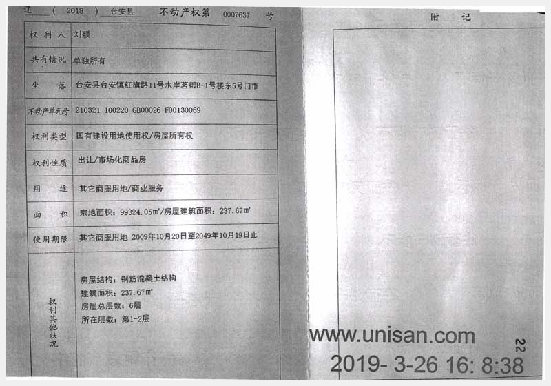 名稱:臺安縣臺安鎮紅旗路11號水岸茗都B-1號樓房產 面積:東4號:181.12㎡、東5號:237.67㎡ 瀏覽次數:1065